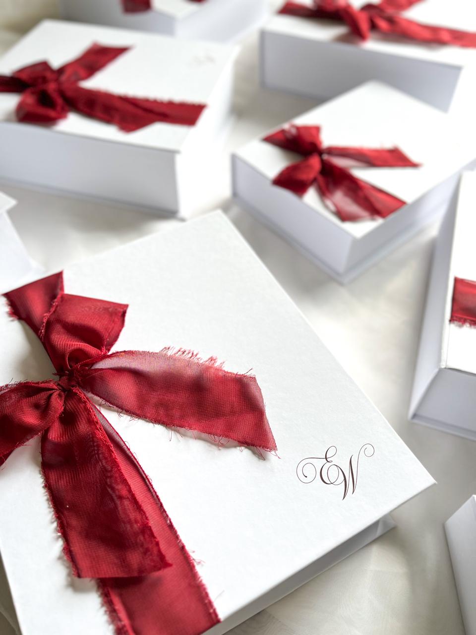 - Caixa cartonada feita com papelão compacto de 2mm de espessura (material resistente), revestido com papel colorplus na cor desejada e fechamento apenas decorativo com laço em tecido.