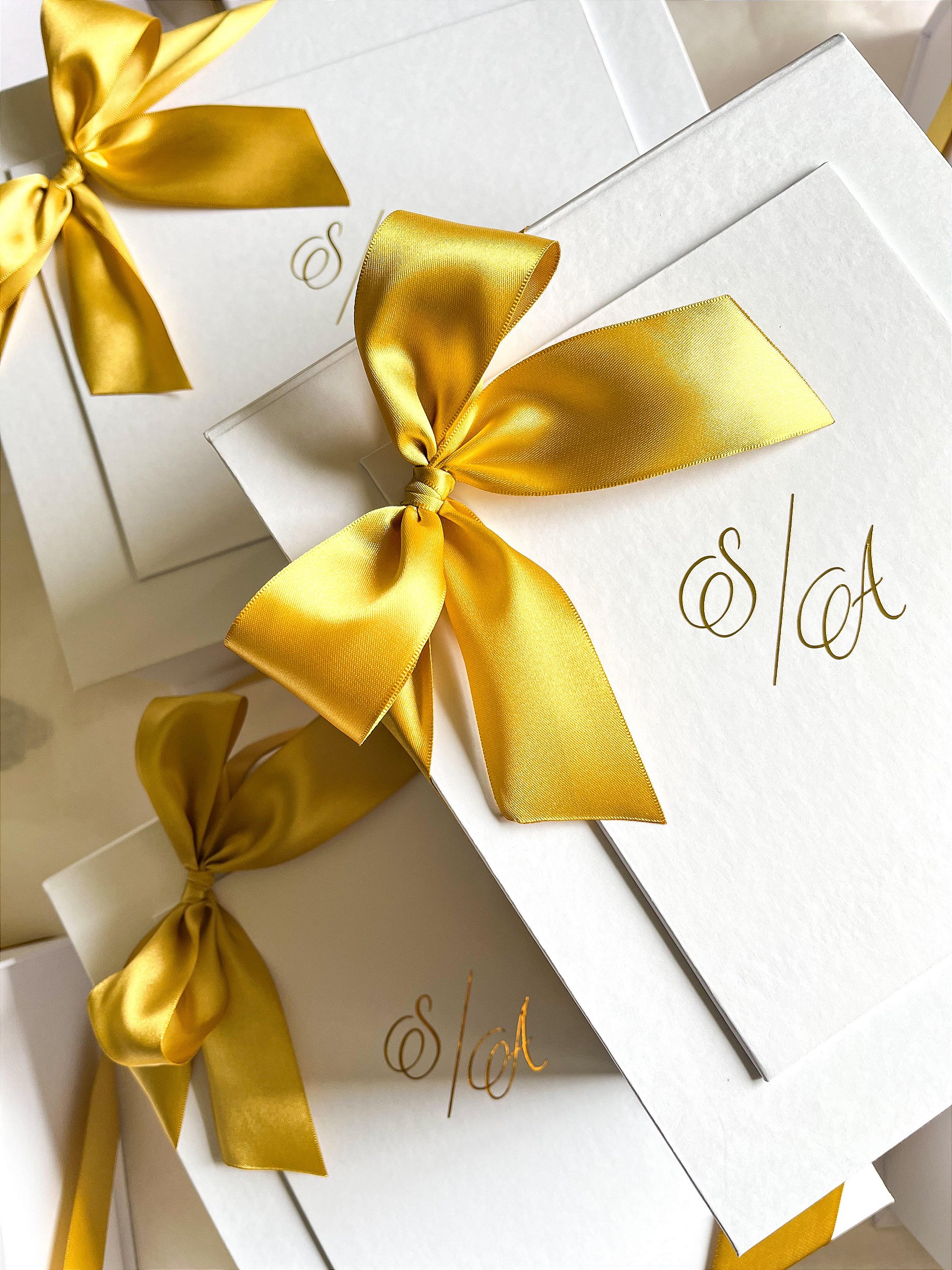 - Caixa cartonada feita com papelão compacto de 2mm de espessura (material resistente), revestido com papel colorplus na cor desejada e fechamento apenas decorativo com laço em tecido.