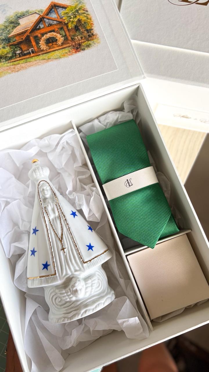 Caixa convite para padrinhos para comportar imagem religiosa (ou outros), gravata e pulseira.