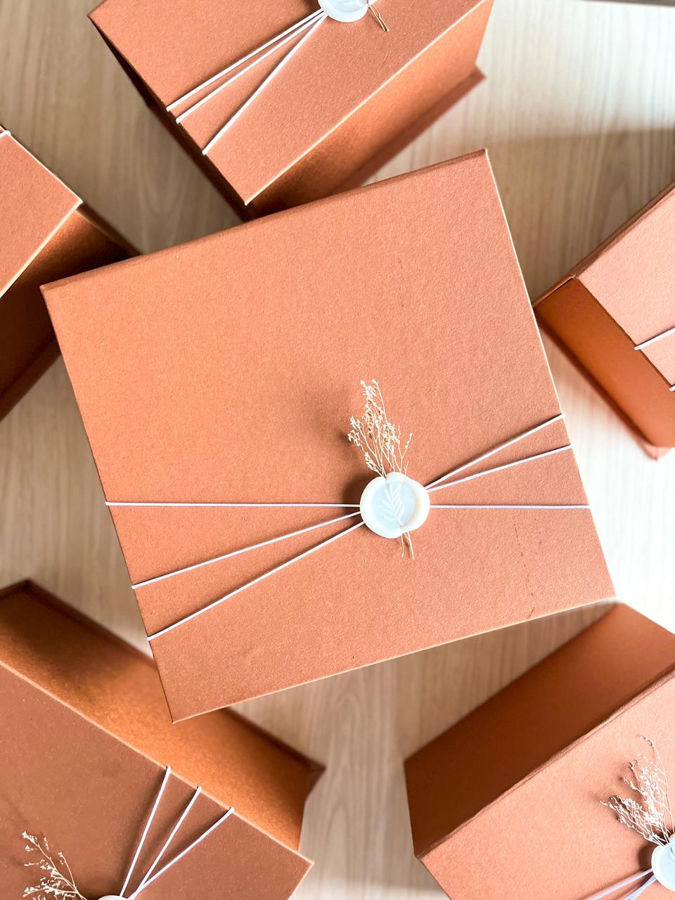 - Caixa cartonada feita com papelão compacto de 2mm de espessura (material resistente), revestido com papel colorplus na cor desejada e fechamento apenas decorativo com laço em tecido.