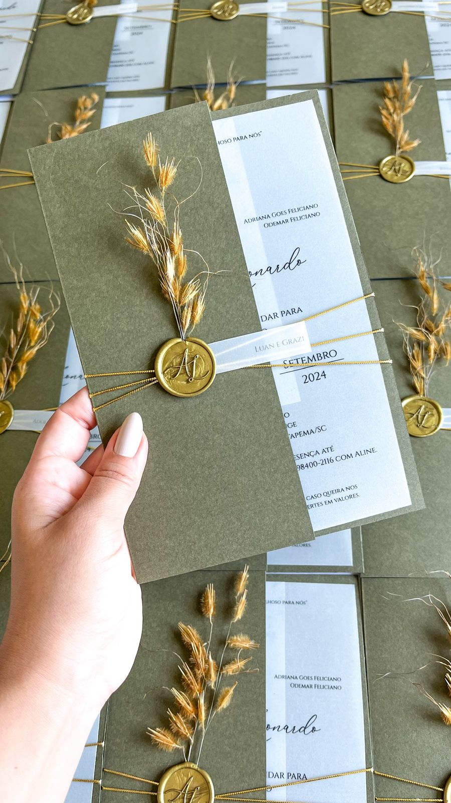 Convite de Casamento com capa em papel colorido, envolvimento em fio de ouro com acabamento em lacre de cera e convite em papel translúcido.