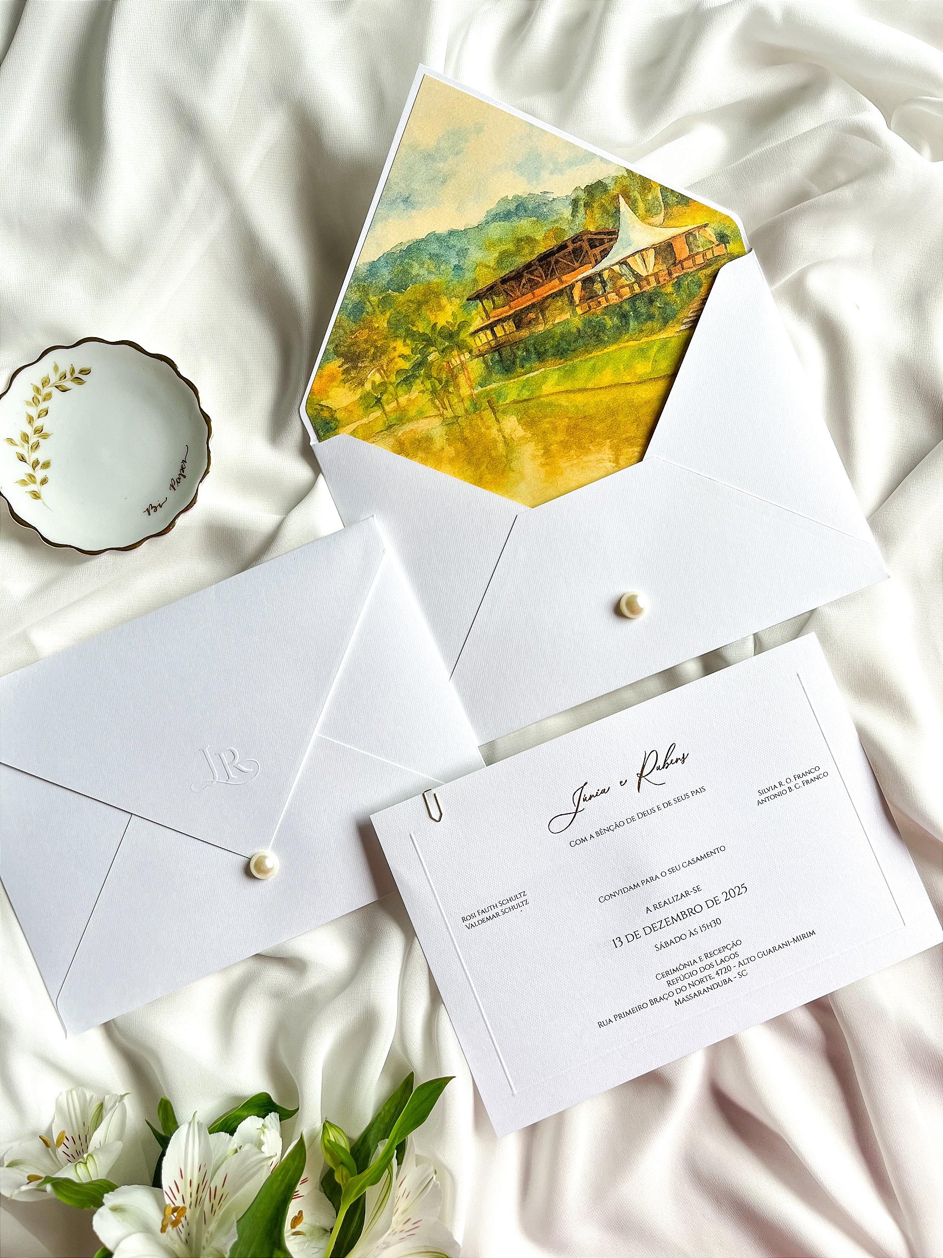Convite de Casamento com envelope e convite texturizado, monograma em relevo, envelope forrado, convite com relevo moldura, nome dos noivos em hotstamp e fechamento em perola